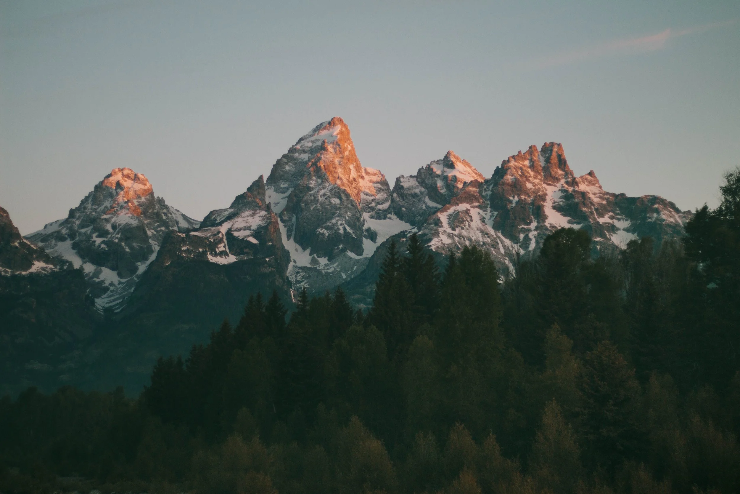 Snow-capped mountains at sunset or sunrise above a forest of green trees.